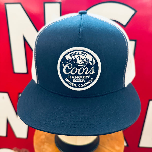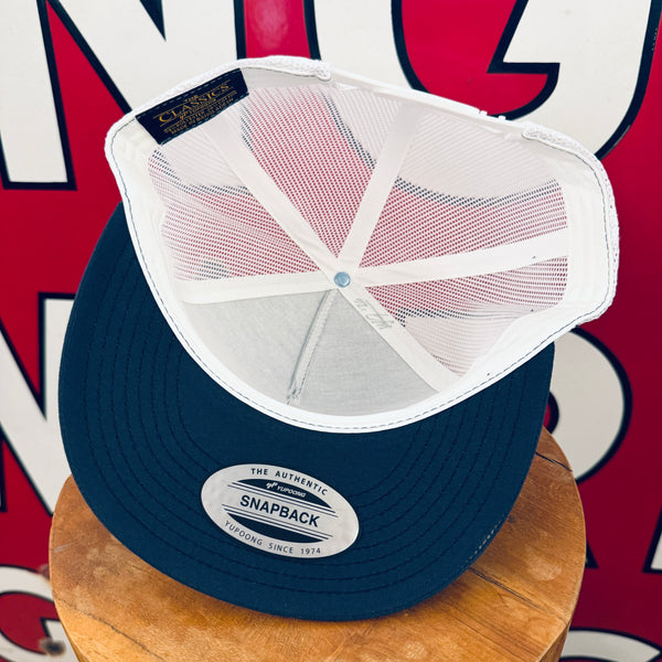 Authentic vintage patch expertly sewn onto a brand new Yupoong 6006 Navy/White Snapback.