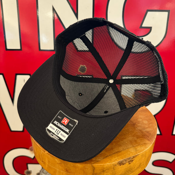 Authentic HD orange/black vintage patch expertly sewn onto a brand new Richardson 112 Black Snapback.